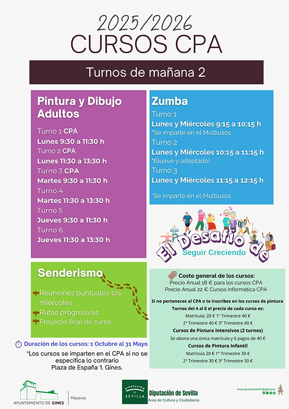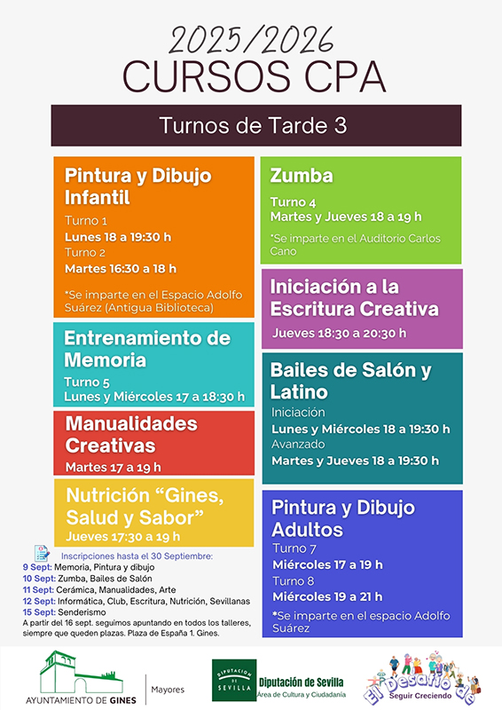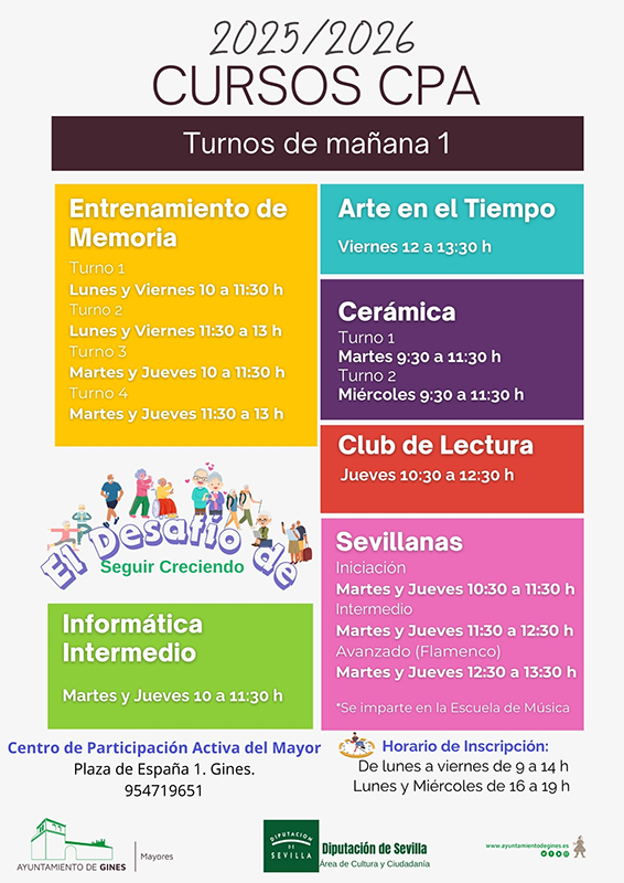 La delegación de Personas Mayores del Ayuntamiento de Gines, en colaboración con la Diputación de Sevilla, ha dado a conocer la oferta de talleres del Centro de Participación Activa con vistas al curso 2025-2026.