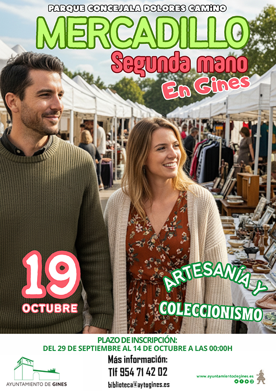 El Parque Concejala Dolores Camino acogerá el próximo 19 de octubre una nueva edición del Mercadillo de Segunda Mano de Gines, una cita que se celebra una vez al mes y que se ha consolidado como un punto de encuentro para quienes buscan artículos únicos, sostenibles y con historia.