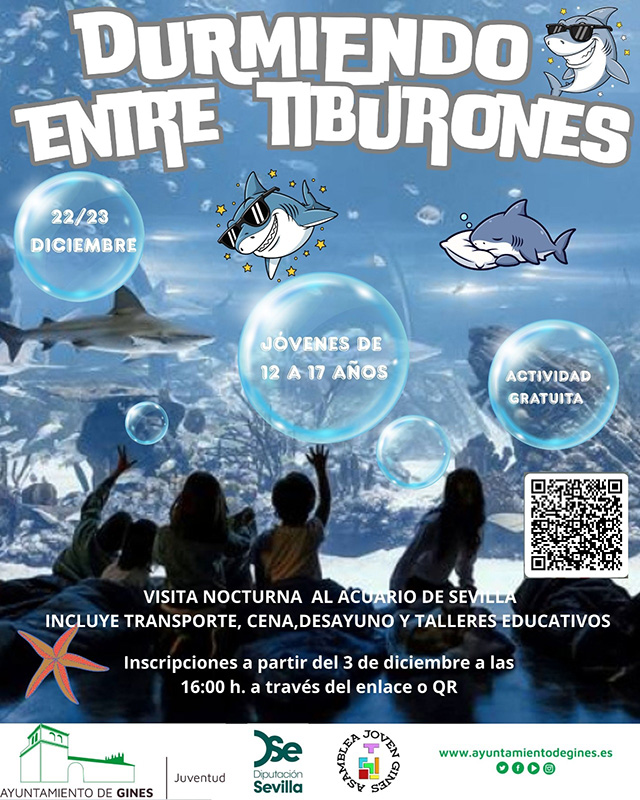 Bajo el sugerente título ‘Durmiendo con tiburones’, las asambleas jóvenes de Gines, Bollullos de la Mitación y Castilleja de Guzmán están preparando para los próximos días 22 y 23 de diciembre una salida al Acuario de Sevilla, una actividad dirigida a jóvenes de 12 a 17 años.