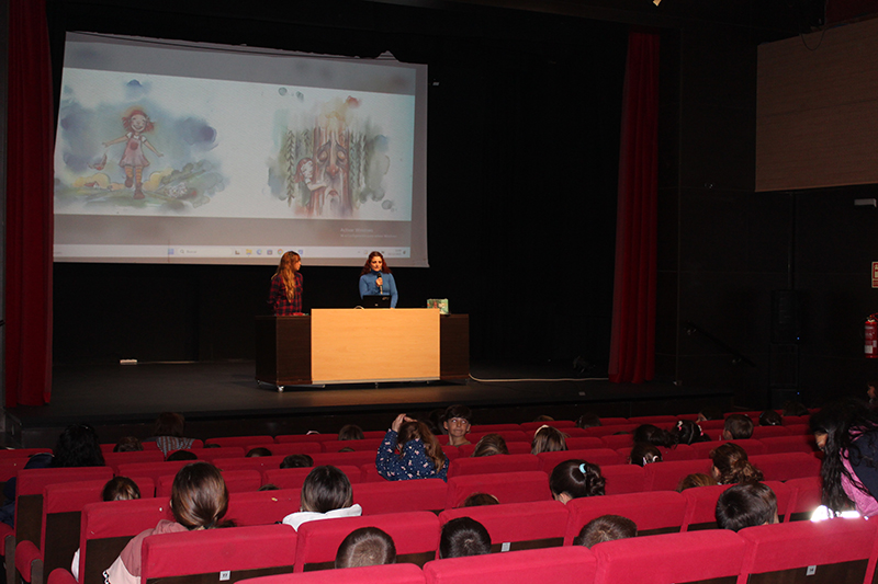 La escritora y autora del cuento, Esther Rodríguez Oyega, junto a la ilustradora Cristina Serrano Orduño, fueron las encargadas de dar vida a la historia, combinando narración en directo e imágenes proyectadas, que permitieron a los niños conocer a la protagonista Margarita y su sauce llorón.