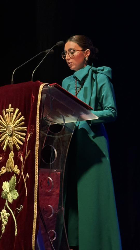Durante su intervención, la pregonera reivindicó especialmente el papel de la mujer dentro de las hermandades y también quiso destacar el verdadero mensaje de la religión, haciendo hincapié en la necesidad de acompañar y estar cerca de las personas más vulnerables o excluidas, recordando que la fe se traduce en compromiso y solidaridad.