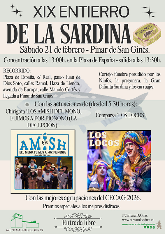 El Entierro de la Sardina trae este sábado 21 a Gines a la chirigota ‘Los Amish del mono’ y la comparsa ‘Los Locos’