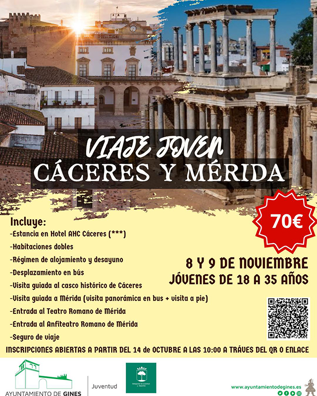 El Ayuntamiento de Gines organiza un Viaje Joven a Cáceres y Mérida los días 8 y 9 de noviembre